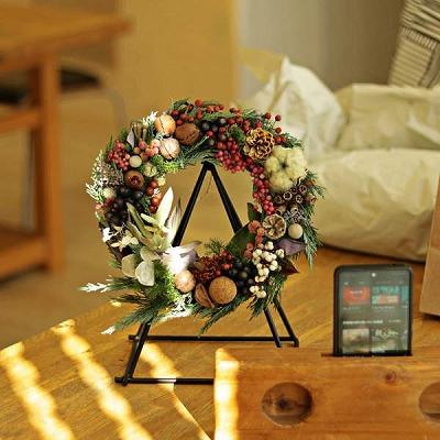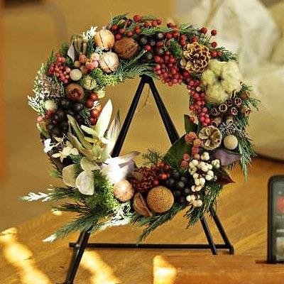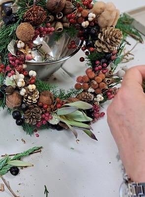 ドライフラワーになる花材を、リーズ台にグルーガンを付けてクリスマスリースを作ります
