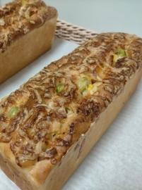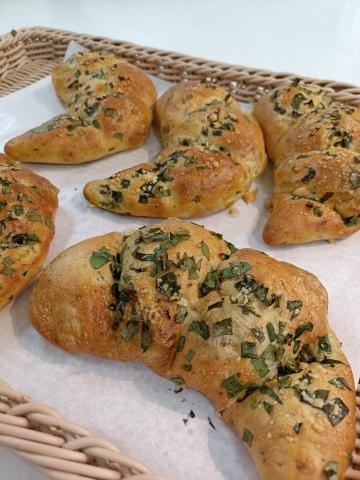 ①フランスパン粉にドライオニオン。ハーブミックス、エダムチーズ、小松菜を練り込んだパンです。