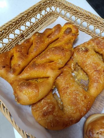 ②フランスパン粉に、一味唐辛子トマトペースト、ピサソースを使い、スパイシーに仕上げたパンです。