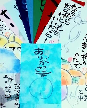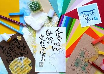 従来の絵手紙の枠にとらわれない自由な発想で、テーマも毎回バラエティー豊かにラインナップ。葉書、色紙、短冊、団扇、封筒、便せん、ポチ袋、カード等々の紙もの、布もの、木もの、石ものetc…、クレヨン、色鉛筆、ボールペン、サインペン、筆ペン、絵の具、スタンプetc…と、素材も画材も様々で何が飛び出すか、毎回のお楽しみです。