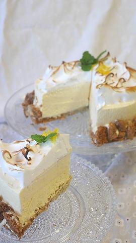 レモン風味のすっきりしたレアチーズにふわしゅわメレンゲをたっぷりのせます。