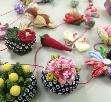 正方形の布を花びらの形に折ったものを組み合わせることで様々な花や蝶などの形を作る技法です。