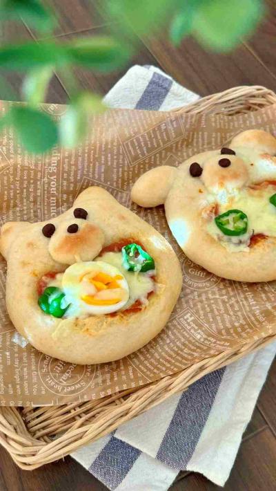 目にも楽しい動物成形のピザ♡持ち帰りしやすいようにミニサイズ2枚を作ります。