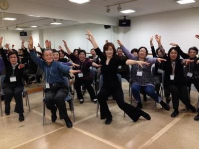 椅子に腰掛け、音楽に合わせてステップを踏むタップダンスのニュースタイル「腰掛タップダンス®」座った状態で転倒の不安もなく足腰の筋力アップに効果的!