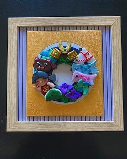 金の兜に金太郎、熊、柏餅まで男の子の節句にちなんだモチーフがいっぱいの楽しい壁掛けです。