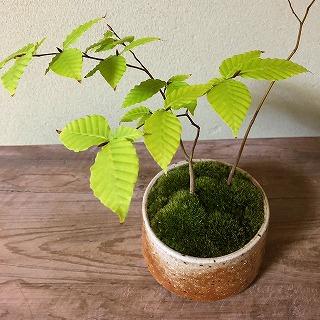 ギザギザとした葉脈が特徴のブナの植物を使います。新緑が美しくシンプルですが趣きある盆栽が出来上がります。鉢は益子焼のものをご用意致します。